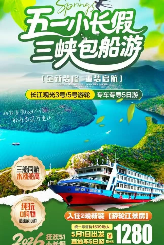 [立战国旅】5.1-5.5【春来三峡】长江观光号春季包船专车赚导5日游